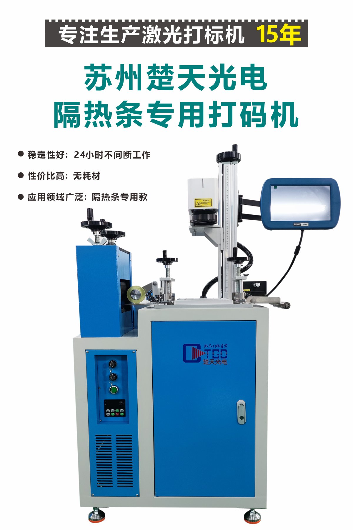這款專為隔熱條設(shè)計的激光打碼機(jī),配有先進(jìn)的進(jìn)出條的夾具和牽引機(jī),設(shè)備運行速度和打標(biāo)速度的提升是這臺設(shè)備的亮點,雙頭隔熱條打碼機(jī),配有上下兩個光路,雙面打標(biāo)更加方便,打標(biāo)清晰,運行速度穩(wěn)定快捷,這臺設(shè)備已是你的不二選擇。