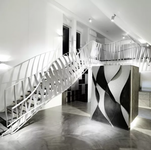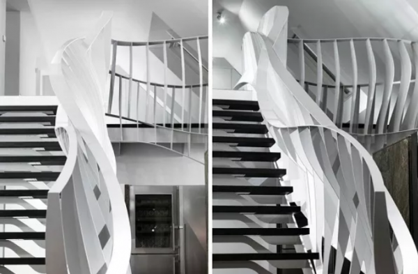 設(shè)計師的巧妙設(shè)計,原本生硬的鋼材,經(jīng)過激光切割機(jī)加工,再進(jìn)行現(xiàn)場定位焊接之后,呈現(xiàn)出流線形狀,成為與生活中常見的樓梯截然不同的藝術(shù)品。